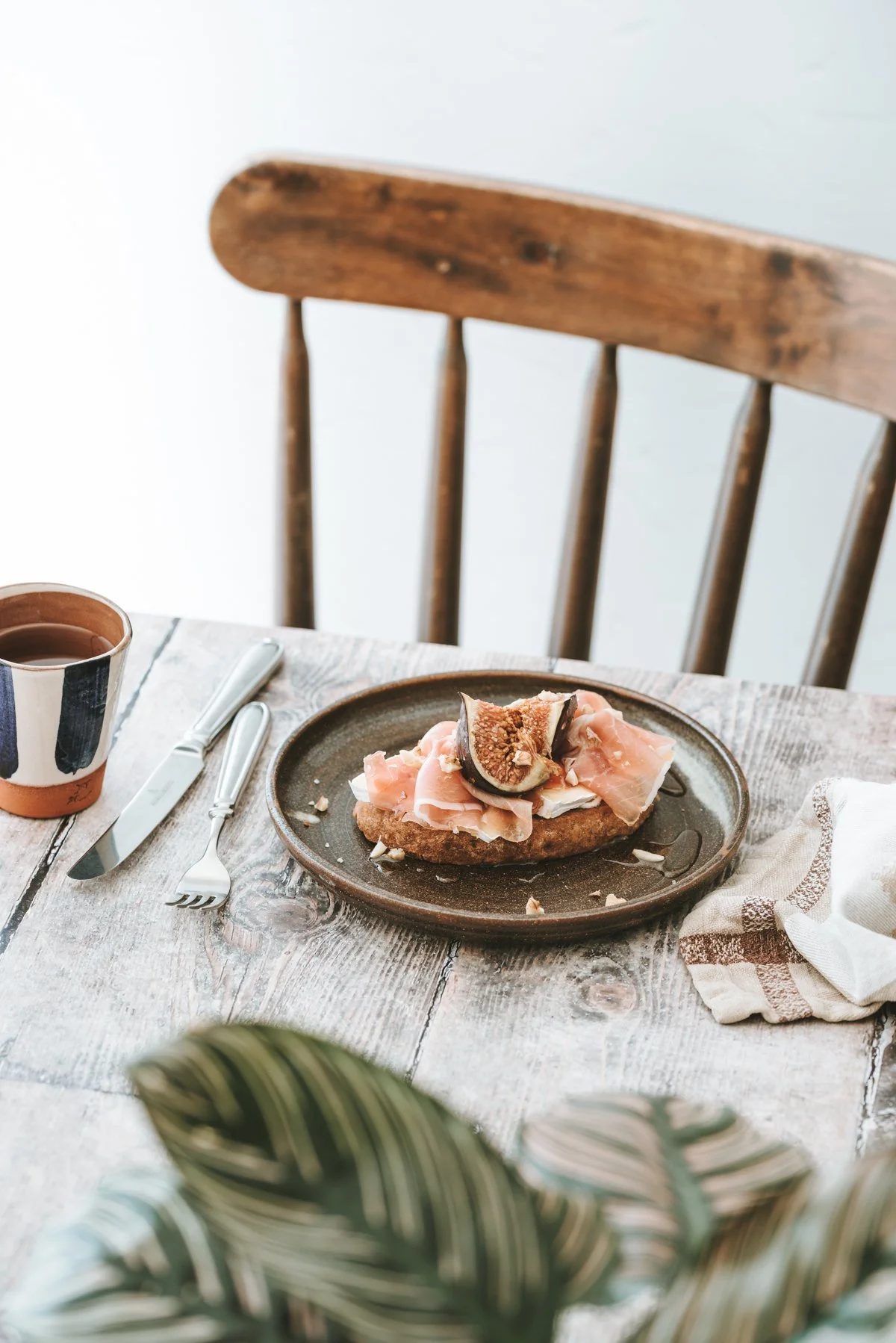 拍攝前設定風格與影像調性才有辦法搭景。我想像食用這份焦糖無花果三明治的季節為初秋時分早午餐時段,光線澄透均值、無強烈光影對比。背景板(背板)設為白色霧面水泥牆,桌板以老木頭紋路呈現。