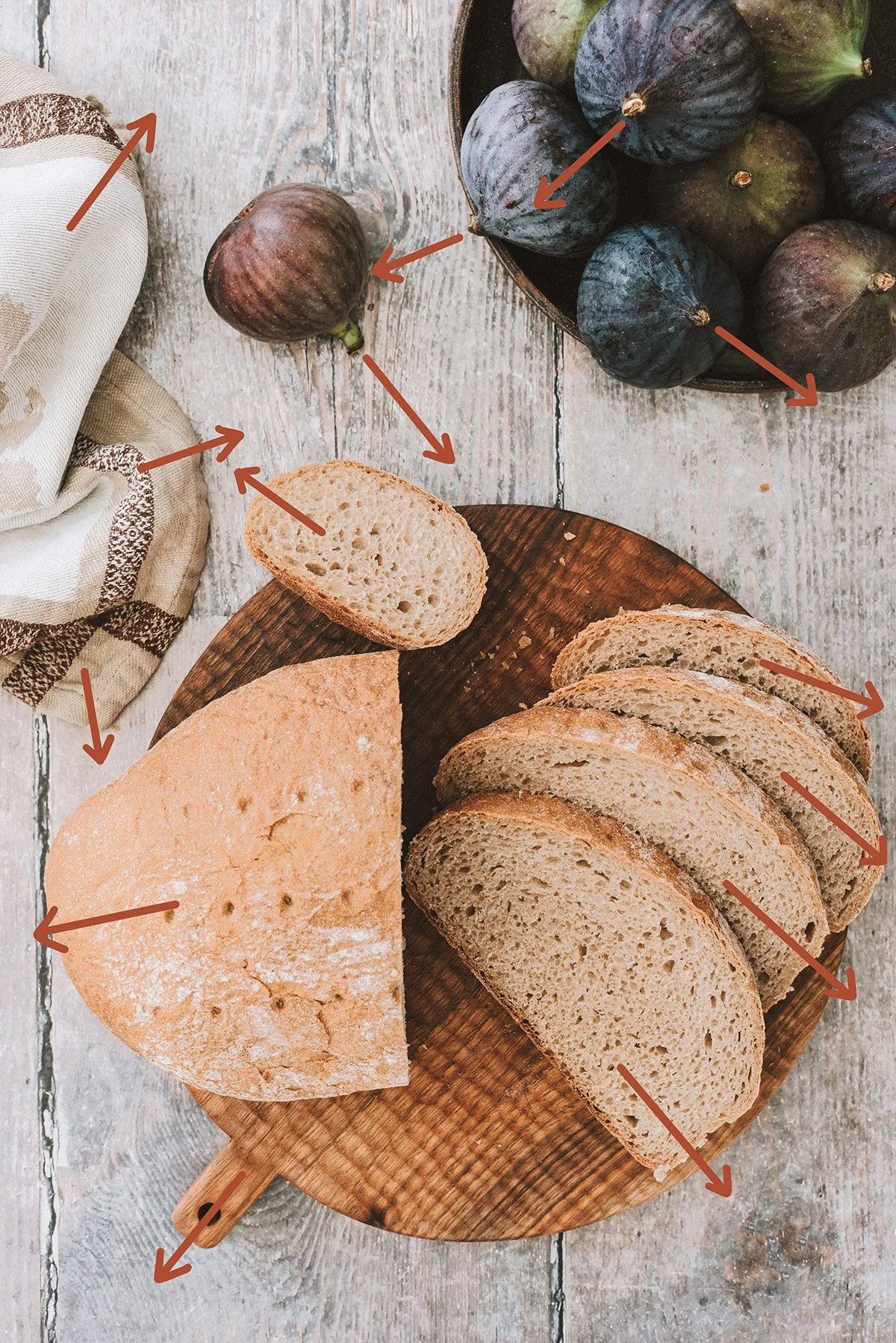 左下角從盤子滾落於桌面的單顆無花果可以當成「重複中的變數」,增加構圖層次。右下角斜角置入的木柄小刀與左下角的手巾就是「來亂的」小配角,也是佈局手法中很重要的存在,影像才不會過於呆板。最後來看下方食材說明的完成圖。