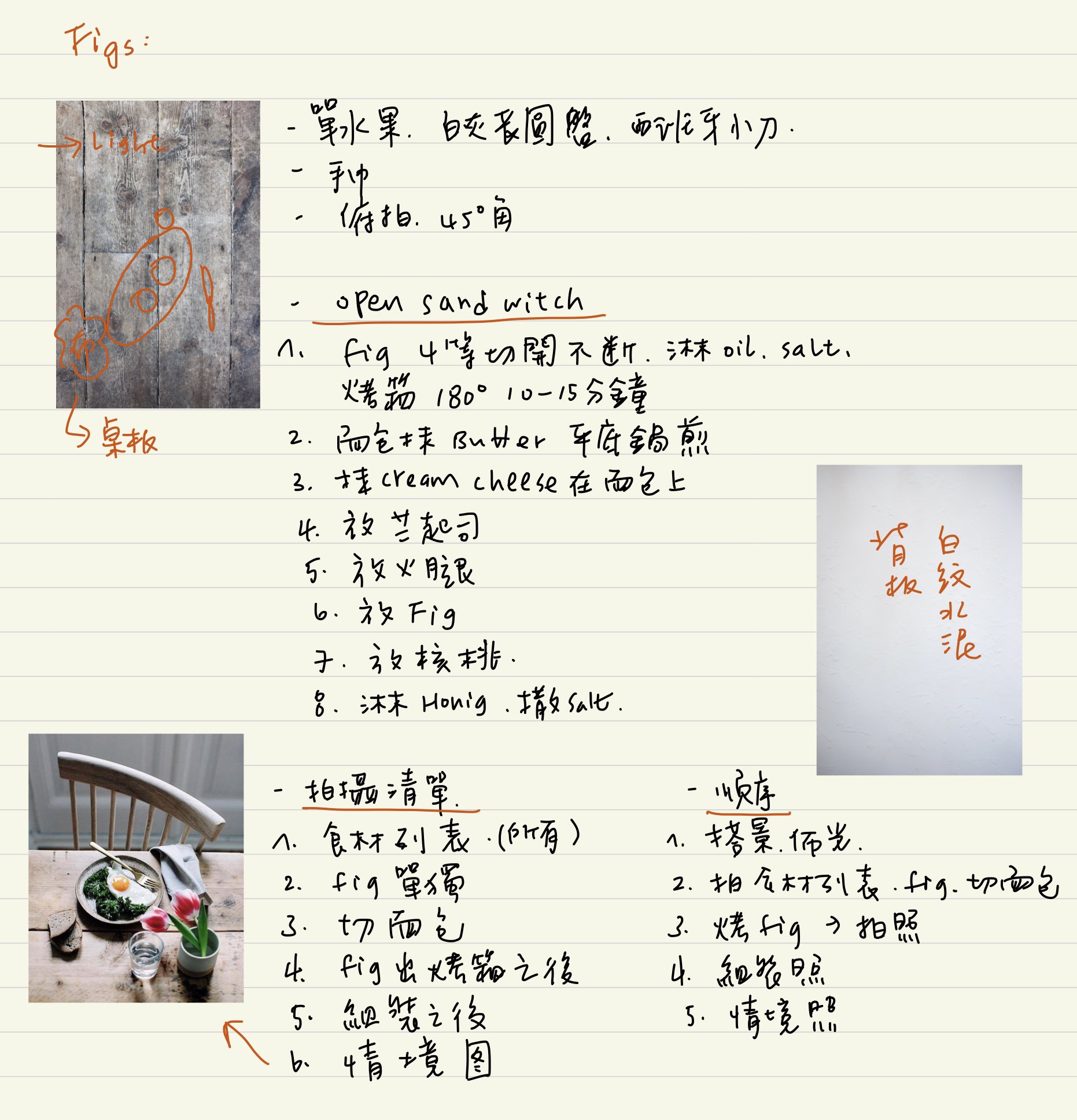 左下角為拍攝畫面清單,記錄有哪些構圖一定得拍,才不會在繁複過程中遺漏某些場景而遲於補救。拍攝清單最末項為「情境圖」,我事先在Pinterest尋找合適靈感,雖然靈感圖與最後成像不同,但繪製草圖時有個實際畫面輔佐可以落實想像,讓天馬行空的細節落在構圖框中,增加規劃時的真實感。