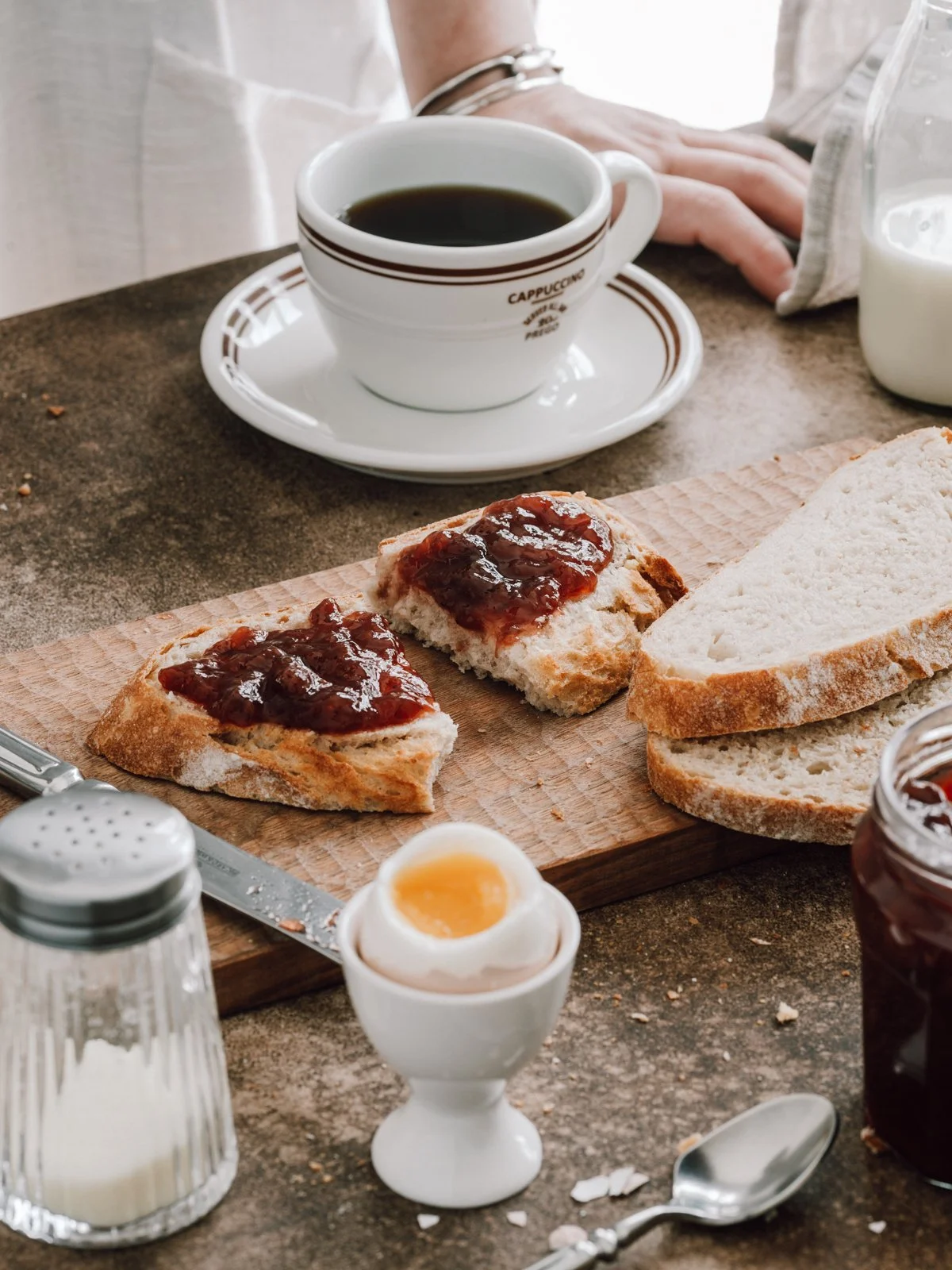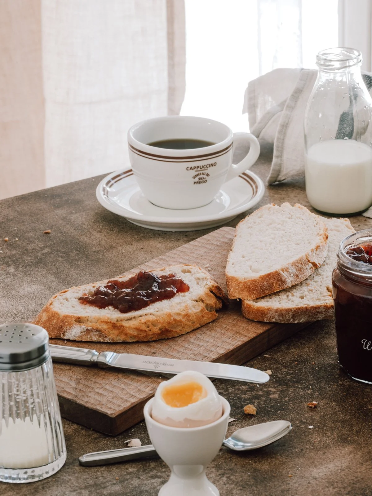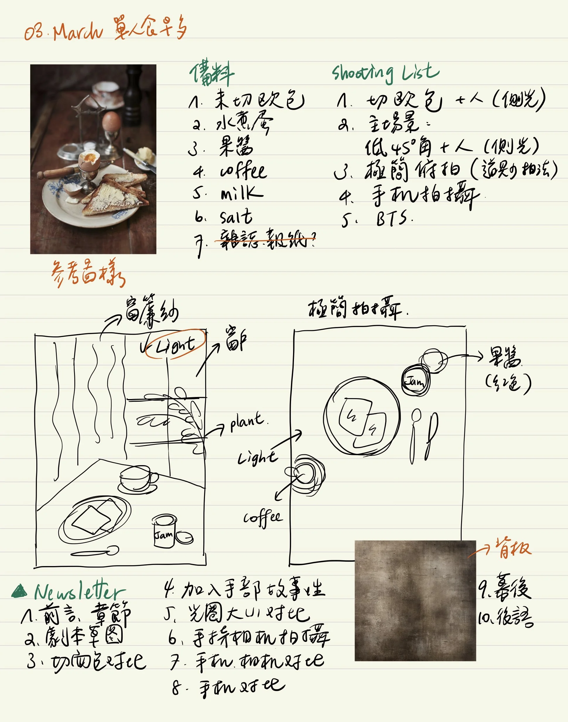 這次拍攝我只以自己的生活習慣為主,早餐喜歡吃什麼、想吃什麼,就準備什麼。以歐式麵包為主,抹上厚厚的奶油與果醬、配上一顆七分熟的水煮蛋,另外還有咖啡。預設的食物種類不多,想保持畫面簡單,讓光線有穿透畫面的機會與虛空間。