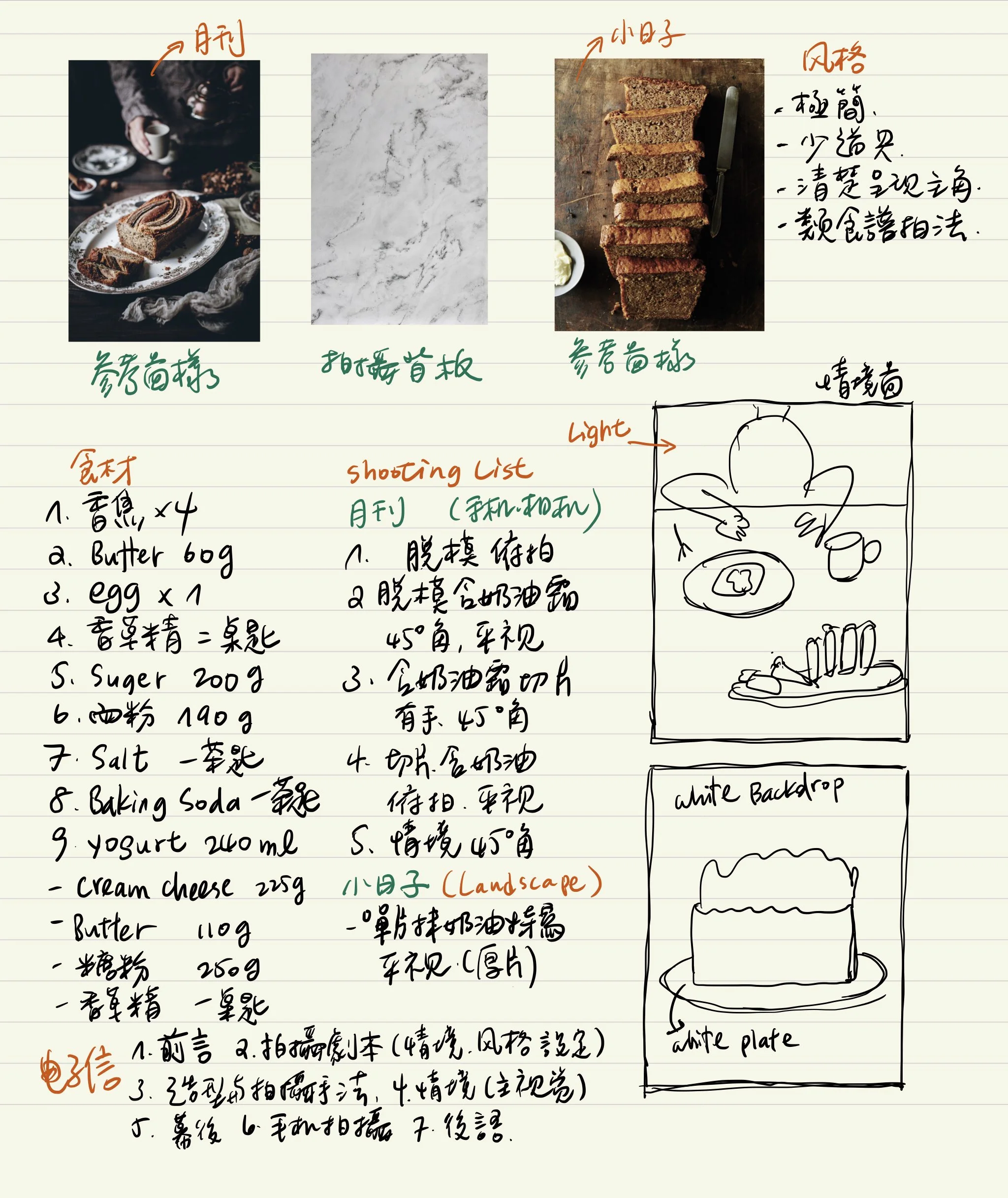 從 ⟪圖二⟫ 拍攝劇本上方的圖片可以看到,我依照分享的載體,針對「電子信」與「雜誌」有不同的主視覺圖像攝定。紀錄了食譜所需的食材、拍攝清單與角度,以及勾勒的草圖。拍攝不熟悉的主題或風格,或是沒有把握的構圖時,我會盡量在劇本上詳盡記錄下所有粗略或臨時的想法,紀錄靈光一現的點子,然後再慢慢整合成為最後的作品,應用在拍攝上。