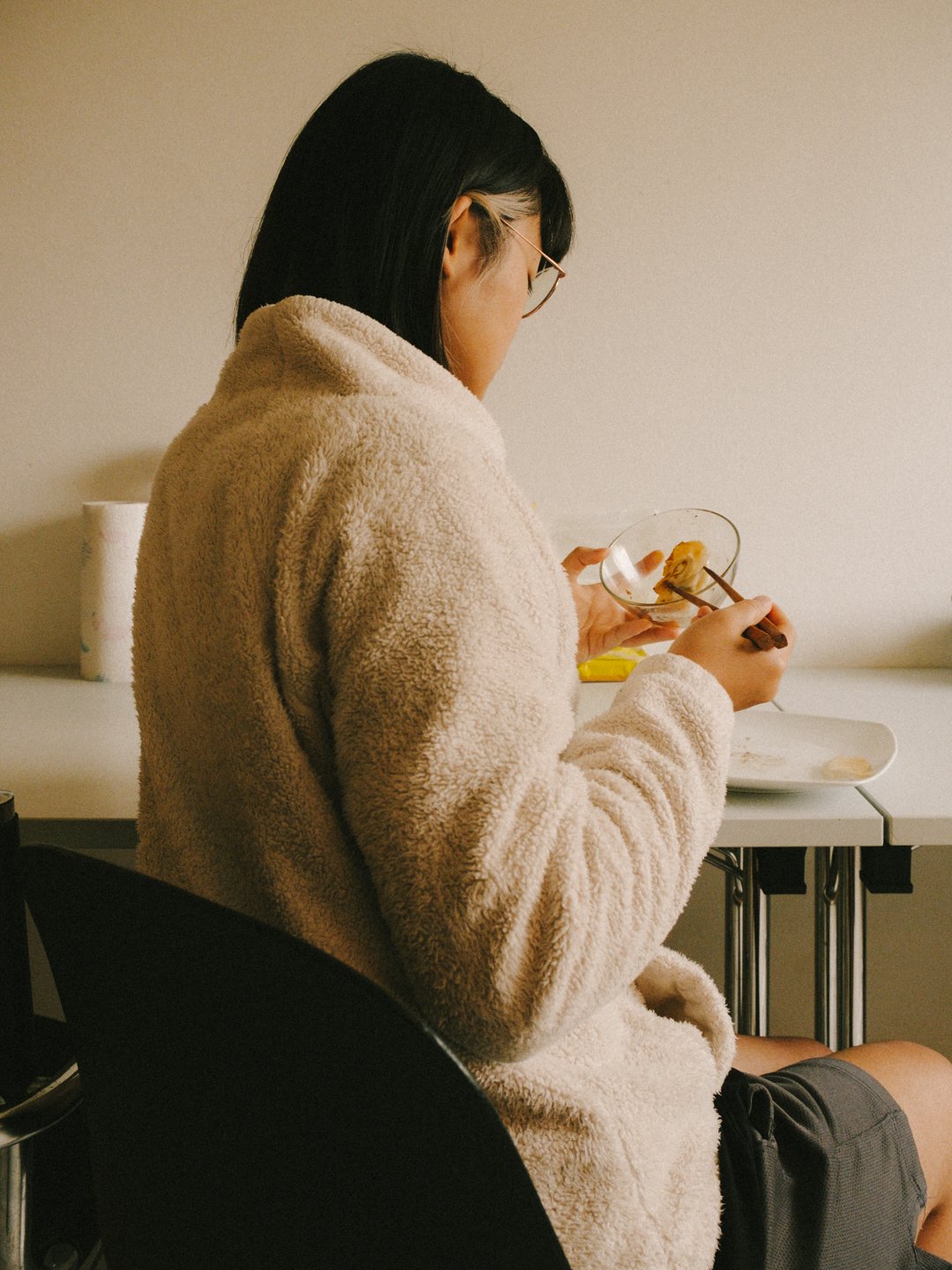 因此我從兩個面向切入這個主題,外在表現上,以7-Photo Collection與Diese Leute呈現;內在,以異鄉人餐桌帶出。我邀請定居在德國的台灣人拍攝異鄉人餐桌系列,以餐桌為背景,到他們居所拍攝料理進食畫面。大多旅居海外的華人,藉由吃食滿足思鄉情緒,但也在飲食時刻,格外想家、感到脆弱。拍攝時,請被拍攝者減少外表的裝扮,藉以呈現生活中真實片刻。