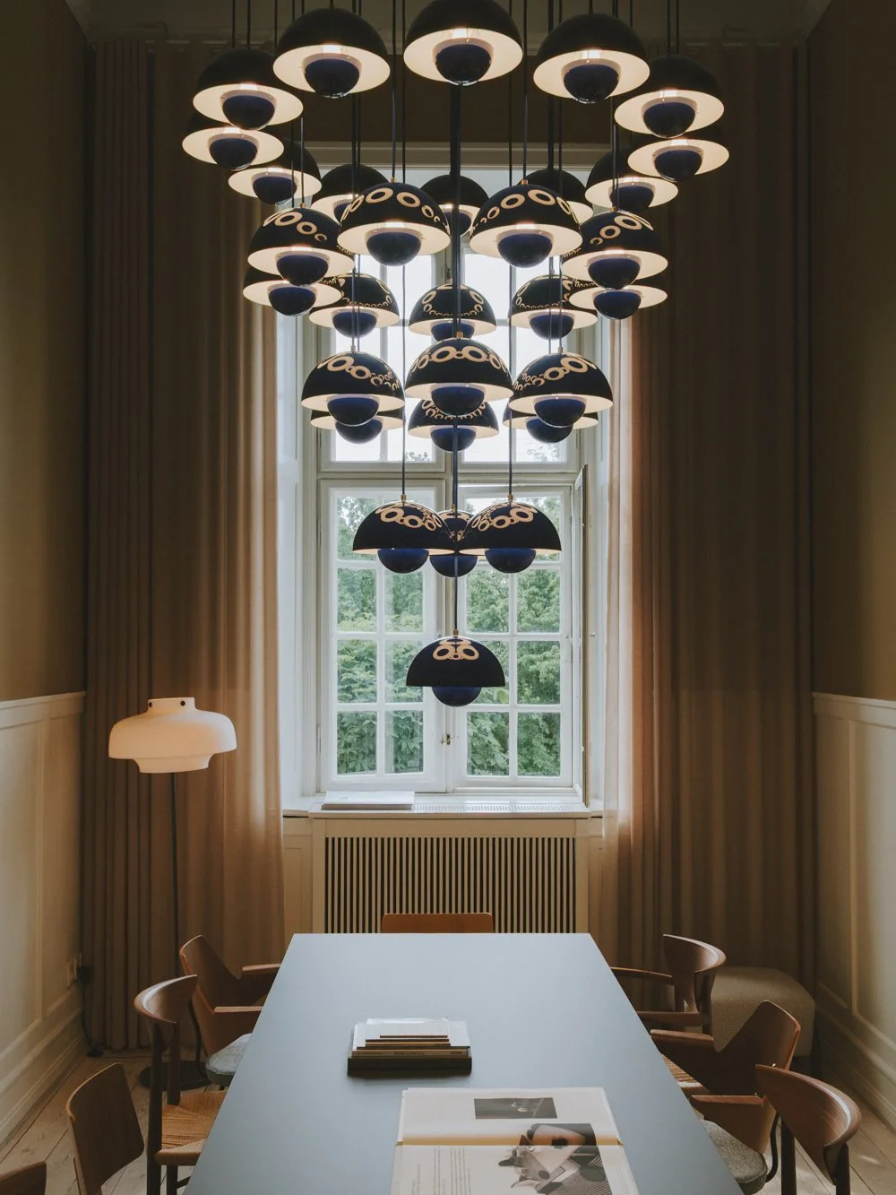 這間小小的、略微幽暗的空間是向 Verner Panton 經典作品 Flowerpot 系列致敬的燈光佈置展,呈現設計師標誌性燈具造型的各種變型,乘載70年代美學,營造出令人沉醉的氛圍。在燈具流瀉出光影交織的靜逸情境中,詮釋創作的精神原形。所有規格與尺寸一次到位,對照造型特色與比例,肯定讓 Flowerpot 的 Panton 迷大呼過癮,也讓我有機會探索這個系列的發展。