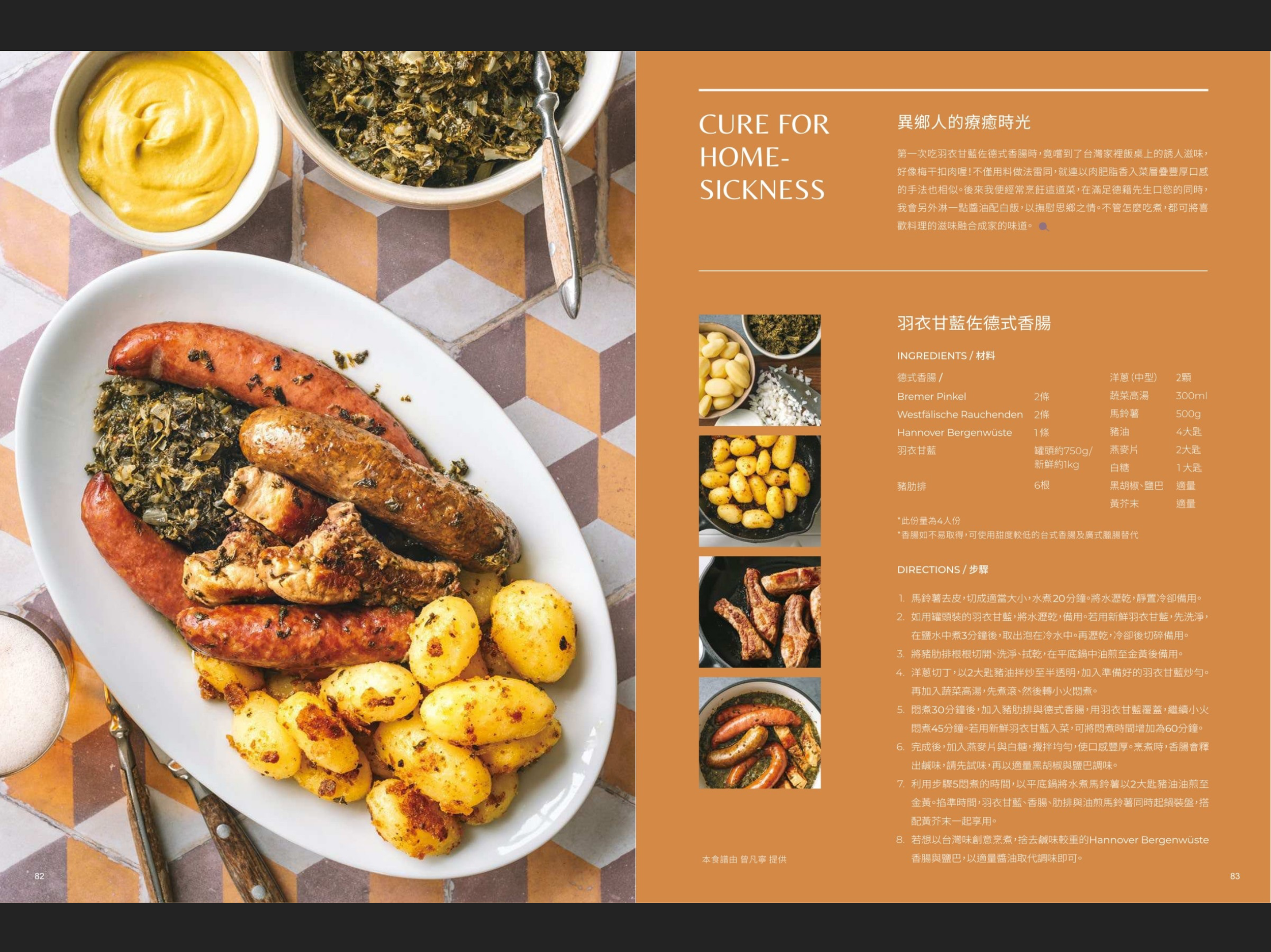 第一次吃羽衣甘藍佐德式香腸時,竟嚐到了台灣家裡飯桌上的誘人滋味,好像梅干扣肉喔。不僅用料做法雷同,就連以肉肥脂香入菜層疊豐厚口感的手法也相似。後來我便常烹飪這道菜,滿足德籍先生口慾。有時以德式正統手法料理,然後再偷淋一點醬油配白飯撫慰我思鄉之情。不管怎麼吃煮,都可將喜歡料理的滋味融合成家的味道。