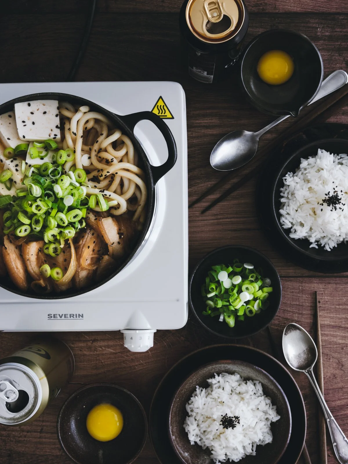 購入豬五花,磨利刀刃切薄片。我喜好洋蔥的鮮甜,因此加入了比食譜多一顆的份量。細細地把兩顆不辣卻使人落淚的洋蔥切絲備好。鐵鍋加熱、置油,待鍋熱放入洋蔥絲翻炒至金黃。再添高湯、醬油、米酒與砂糖,調小火煨洋蔥至軟。 然後鋪上五花肉片、豆腐,再將火調致中火煲煮。熄火前三分鐘置入烏龍麵,闔蓋以小火悶煮使之吸飽湯汁。